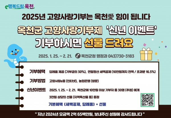[충청뉴스큐] 옥천군은 고향사랑기부제 시행 3년 차를 맞이해 설 명절을 포함한 1월 25일부터 2월 21일까지 신년 맞이 이벤트를 추진한다.