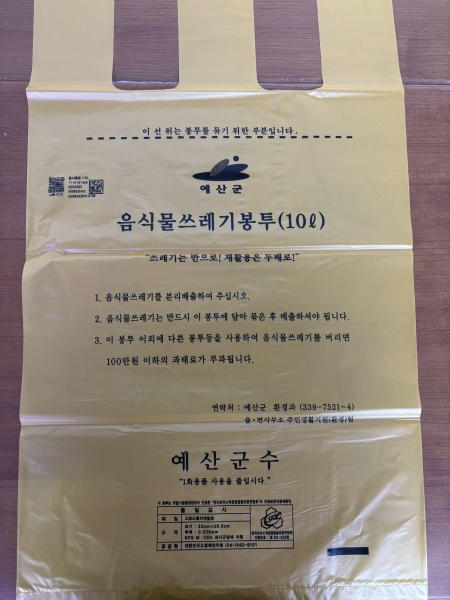 [충청뉴스큐] 예산군이 1월 1일부터 단독주택에서 발생 되는 음식물쓰레기 발생량을 줄이고 음식물쓰레기 적정 분리배출을 위해 단독주택 음식물 종량제 봉투 사용을 시행한다고 밝혔다.