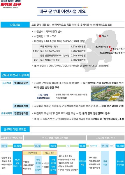 대구 군부대 이전은 대구 미래 100년을 위한 민선 8기 ‘100+1 혁신사업’ 중 미래혁신 주요 사업이자 홍준표 대구광역시장의 핵심 공약사업으로 추진 중이다.