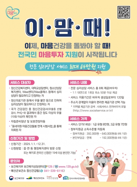 전국민 마음투자 지원사업은 2024년부터 시행된 사업으로 우울·불안 등 정서적 어려움을 겪는 군민에게 120일간 8회분 대화기반의 전문심리상담을 받을 수 있는 바우처를 발급해 국가·민간자격을 갖춘 상담기관이 대면상담서비스를 제공한다.
