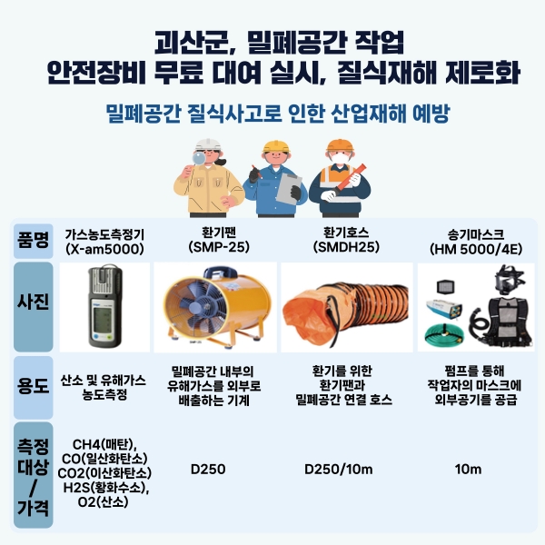 [충청뉴스큐] 충북 괴산군은 밀폐공간에서 작업 시 필요한 안전 장비를 무료로 대여하는 사업을 실시한다고 23일 밝혔다.
