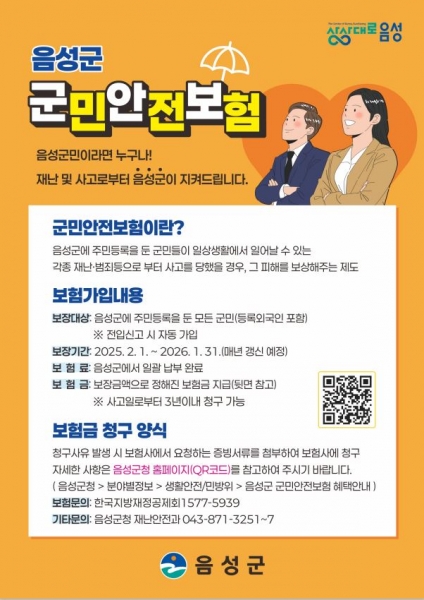조병옥 군수는 “음성군민 누구나 군민안전보험 혜택을 받을 수 있도록 제도 운영과 홍보에 최선을 다하겠다”며 “앞으로도 누구나 안심하고 생활할 수 있는 안전한 음성군을 만들어 나가겠다”고 밝혔다.