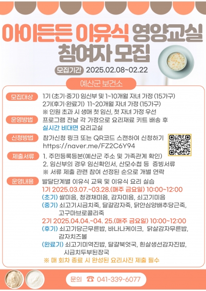 [충청뉴스큐] 예산군보건소는 관내 임신부 및 20개월 이하 자녀를 둔 가정을 대상으로 ‘아이든든 이유식 영양교실’ 참여자를 오는 2월 8일부터 22일까지 모집한다.