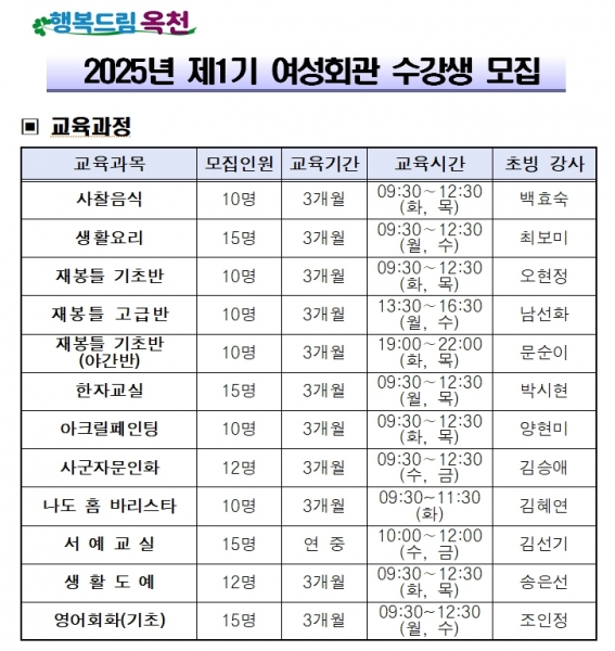 [충청뉴스큐] 옥천군은 여성들의 잠재된 능력을 개발할 수 있도록 2025년 제1기 여성회관 기술·취미교육 수강생을 2월 6일부터 14일까지 모집한다.