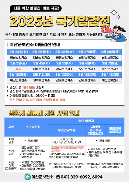 검진 일정은 △2월 24일 봉산보건지소 △2월 25일 대술보건지소 △2월 26일 응봉보건지소 △2월 27일 신양보건지소 △2월 28일 신암보건지소 △3월 4일 대흥보건지소 △3월 5일 광시보건지소 △3월 6일 오가보건지소 △3월 7일 덕산보건지소 △3월 10, 14일 예산군보건소 △3월 11일 고덕보건지소 △3월 12, 13일 삽교보건지소이며 검진 대상자는 신분증을 지참해 당일 오전 8시부터 11시 30분까지 방문하면 된다.
