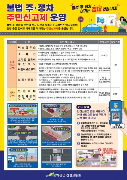 [충청뉴스큐] 예산군이 안전을 위협하는 6대 불법 주정차로부터 군민을 지키기 위해 현장 확인 없이 신고 가능한 안전신문고 주민신고제를 시행한다고 밝혔다.