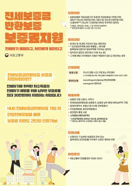 군은 전세보증금 반환 보증 보증료 지원을 2023년에 청년, 신혼부부를 대상으로 시작해 지난해부터는 전 연령대의 저소득층까지 확대해 지원하고 있으며 대상자로 선정되면 기 납부한 전세보증금반환보증 보증료를 가구당 최대 30만원까지 지원한다.