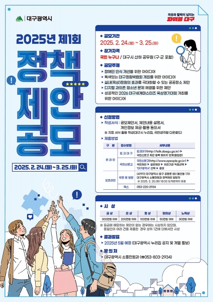 [충청뉴스큐] 대구광역시는 전 국민 및 대구시 산하 공무원의 창의적인 아이디어를 시정에 적극 반영해 정책의 효과성을 제고하기 위해 ‘2025년 제1회 정책제안 공모’를 추진한다.