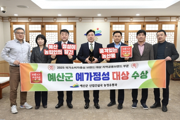 [충청뉴스큐] 예산군 농특산물 공동브랜드 ‘예가정성’ 이 브랜드 및 선호도 측면에서 소비자에게 높은 평가를 받아 지난해에 이어 올해도 ‘2025 국가 소비자중심 브랜드 대상’ 수상의 영예를 안았다.