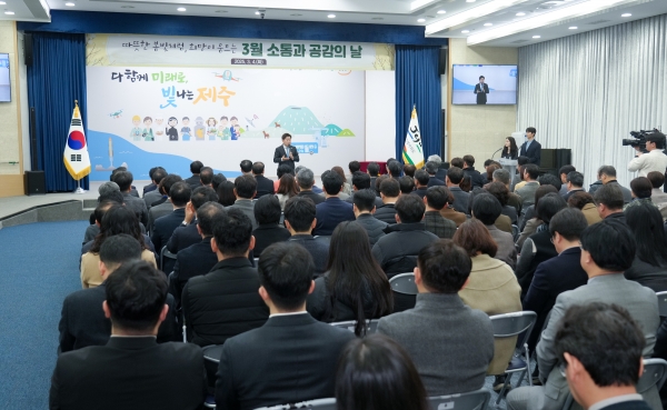 [충청뉴스큐] 오영훈 제주특별자치도지사는 4일 오전 도청 탐라홀에서 열린 ‘3월 소통과 공감의 날’ 행사에서 분산에너지 특구 지정을 통한 제주형 에너지 혁신과 제주 고유의 역사문화 정체성 확립을 강조했다.