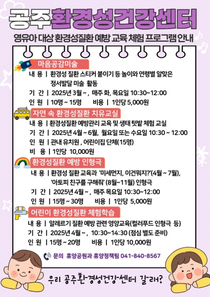 전병윤 휴양공원과장은 “환경성 질환을 예방하려면 성장 과정에서 환경오염 노출을 줄이고 사전 예방적 관리가 중요하다”며 “앞으로도 영유아 맞춤형 프로그램을 지속적으로 발굴해 공주시가 선도적인 역할을 하겠다”고 밝혔다.