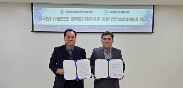 [충청뉴스큐] 예산군장애인종합복지관은 예산군 조사료협회와 ‘지역 장애인과 사회적 약자 복지증진 및 다양한 후원 활동을 지원하기 위한 업무협약’을 체결했다고 7일 밝혔다.