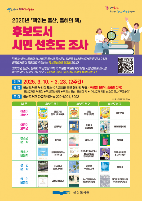 이번 시민 선호도 조사는 3월 10일부터 23일까지 울산도서관 누리집을 통해 참여할 수 있다.