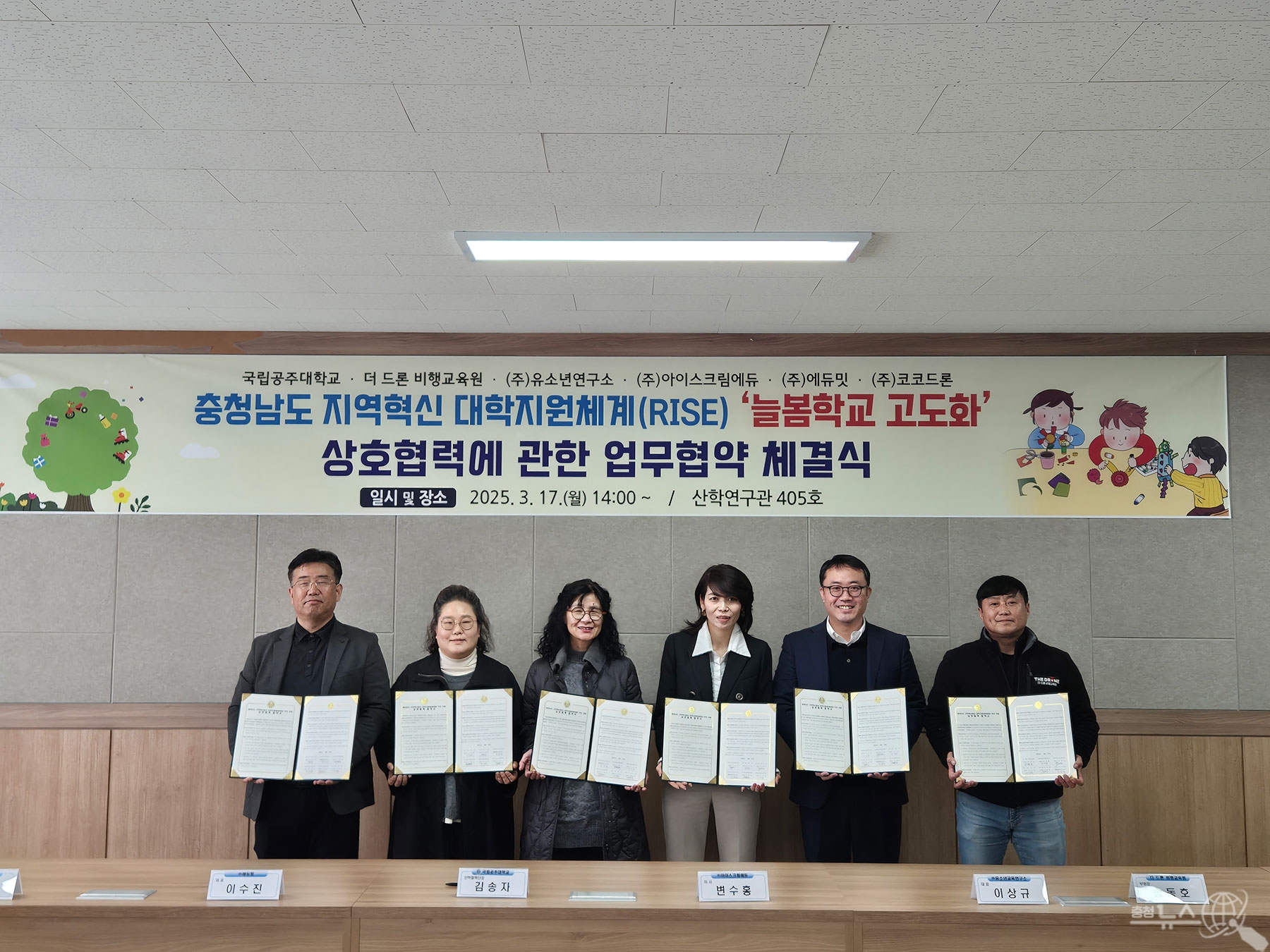 국립공주대학교(총장 임경호) RISE전략센터(센터장 김송자)는 지난17일 공주캠퍼스 산학연구관 4층 회의실에서 충청남도 지역혁신중심 대학지원체계(RISE) ‘늘봄학교 고도화’사업 추진을 위해 분야별 교육 전문기관과 업무협약을 체결했다고 밝혔다.