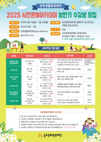 [충청뉴스큐] 공주문화관광재단에서 공주시민을 대상으로 강북생활문화센터 시민문예아카데미 상반기 수강생을 모집한다.