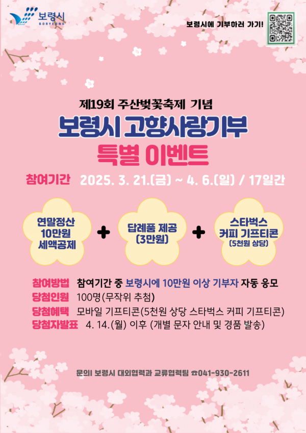 [충청뉴스큐] 보령시는 제19회 주산벚꽃축제를 맞아 3월 21일부터 4월 6일까지 17일간 고향사랑기부제 참여 이벤트를 진행한다.