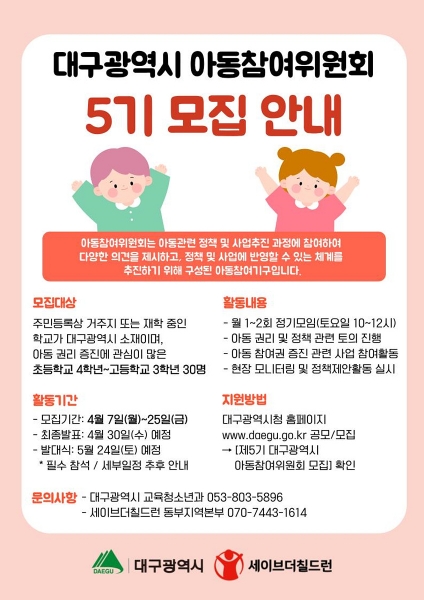 [충청뉴스큐] 대구광역시는 제5기 아동참여위원회 운영을 위한 아동·청소년 위원을 4월 7일부터 4월 25일까지 공개 모집한다.