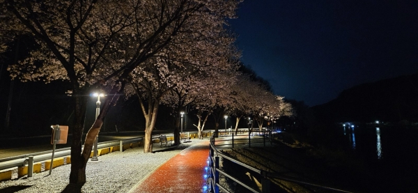 [충청뉴스큐] 음성군이 무극저수지 자전거도로 일대에 쉼터와 함께 경관조명을 설치해 야간에도 벚꽃을 즐길 수 있는 새로운 명소로 주목받고 있다.