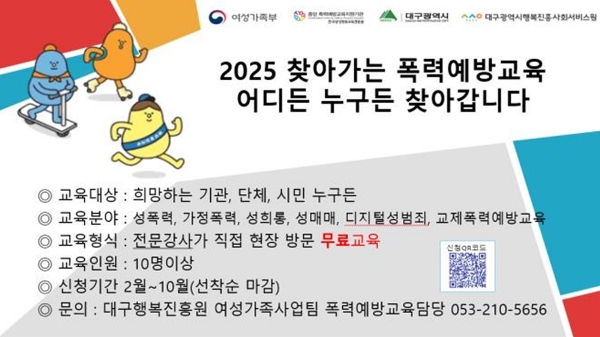 교육을 희망하는 기관은 대구광역시행복진흥사회서비스원으로 문의하거나 ‘예방교육통합관리’ 홈페이지를 통해 신청할 수 있다.