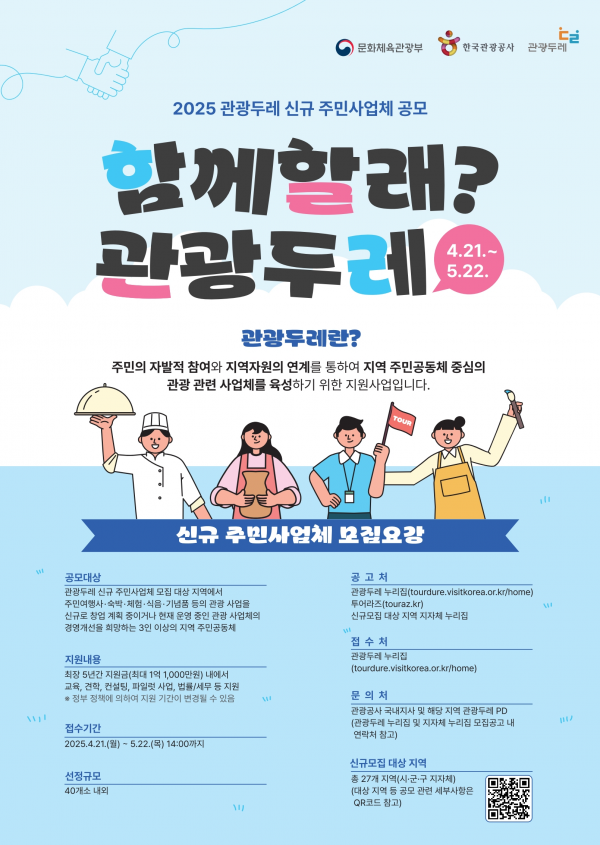 [충청뉴스큐] 문화체육관광부와 한국관광공사는 21일부터 5월 22일까지 ‘관광두레’에 참여할 주민사업체를 모집한다.