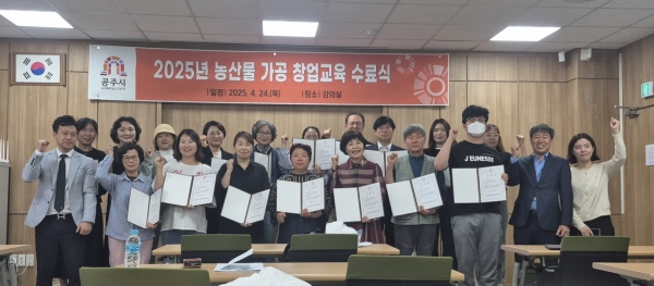 [충청뉴스큐] 공주시는 지난 24일 농업기술센터에서 ‘농산물 가공 창업 교육 통합과정’ 수료식을 열고 총 21명의 교육생이 교육을 마쳤다고 밝혔다.