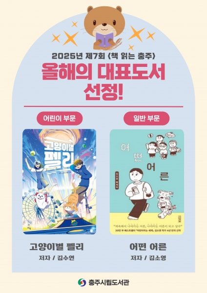 [충청뉴스큐] 충주시립도서관은 올해 제7회 ‘책 읽는 충주’ 독서운동의 올해의 대표 도서로‘고양이별 펠리’ 와‘어떤 어른’ 이 최종 선정됐다고 13일 밝혔다.