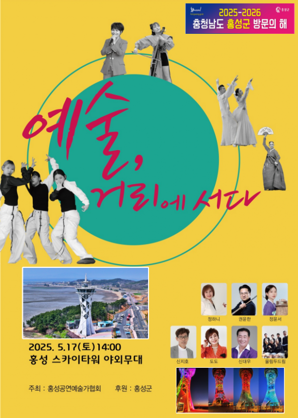 홍성군에 따르면, 오는 17일 오후 2시부터 5시까지 스카이타워 광장 야외무대에서는 홍성공연예술가협회가 주관하는 문화예술 공연 ‘2025 예술, 거리에 서다’ 가 열린다.