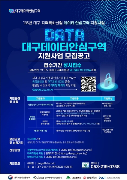 [충청뉴스큐] 대구광역시는 5월 8일 과학기술정보통신부로부터 ‘데이터산업진흥 및 이용촉진에 관한 기본법’ 제11조 및 ‘데이터안심구역 지정 및 운영에 관한 지침’에 따른 지정 기준을 충족해, 영남권 최초의 ‘데이터안심구역 지역거점’ 으로 최종 지정됐다.