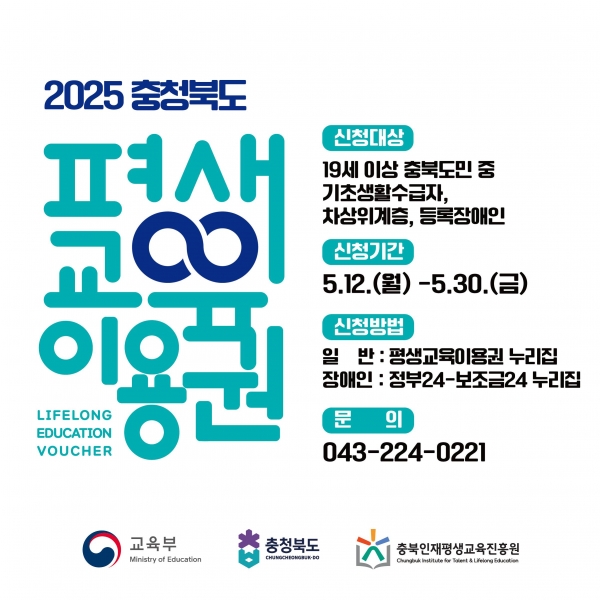 [충청뉴스큐] 옥천군은 경제적 여건에 따른 교육격차를 완화하고 주민의 자기계발 및 자아실현을 지원하기 위해‘충북 평생교육이용권’ 신청을 5월 30일까지 접수한다.