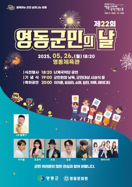 영동군은 오는 5월 26일 영동체육관 일원에서 ‘제22회 영동군민의 날’ 기념행사를 개최한다고 밝혔다.