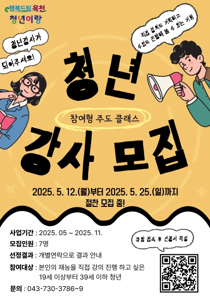 프로그램 신청은 붙임의 안내문에 기재된 QR코드를 통해 가능하며 자세한 사항은 옥천군 청년센터 ‘청년이랑’ 으로 문의하면 된다.