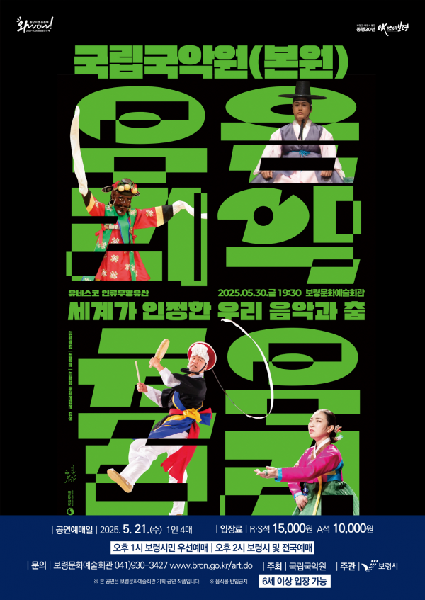 [충청뉴스큐] 보령시는 국립국악원이 오는 30일 오후 7시 30분 보령문화예술회관에서 유네스코 인류무형문화유산으로 등재된 한국 전통 공연 예술을 선보이는 기획 공연 ‘유네스코, 세계가 인정한 우리 음악과 춤’을 개최한다고 밝혔다.