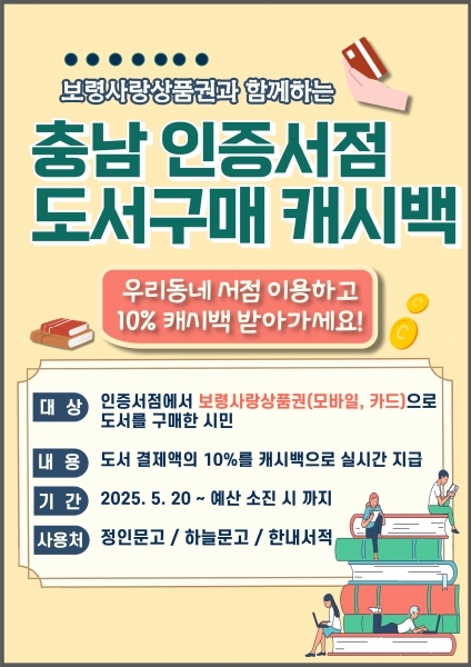 [충청뉴스큐] 보령시가 지역 서점 활성화와 시민들의 독서문화 진흥을 위해 ‘2025년 충남 인증서점 도서구매 캐시백 지원’ 사업을 시행한다고 밝혔다.