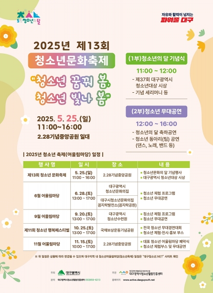 [충청뉴스큐] 대구광역시는 5월 25일 오전 11시 2·28기념중앙공원에서 ‘2025년 제13회 청소년문화축제’를 개최한다.