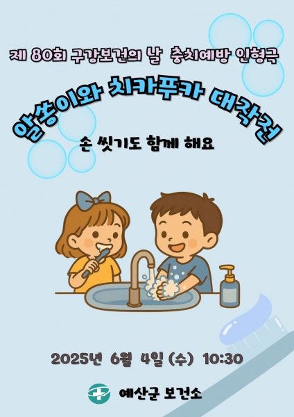 [충청뉴스큐] 예산군보건소는 제80회 구강보건의 날을 맞아 건강한 구강생활 실천 분위기를 조성하고자 오는 6월 4일 예산군청 추사홀에서 충치예방·손 씻기 어린이 인형극을 개최한다.