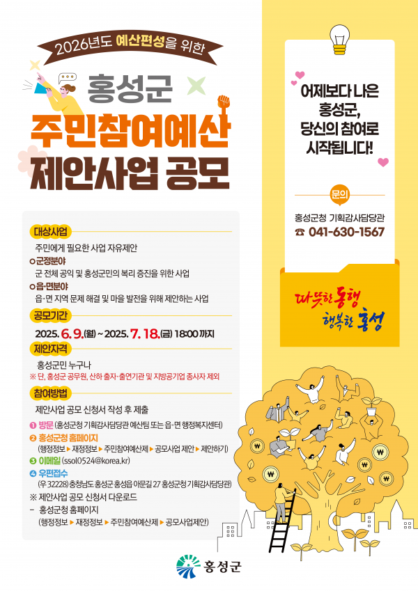 [충청뉴스큐] 홍성군은 예산 편성 과정에 주민의 참여 기회를 보장하고 재정 운영의 투명성과 공정성을 높이기 위해 2026년도 예산 편성을 위한 주민참여예산 제안사업 공모를 실시한다고 밝혔다.