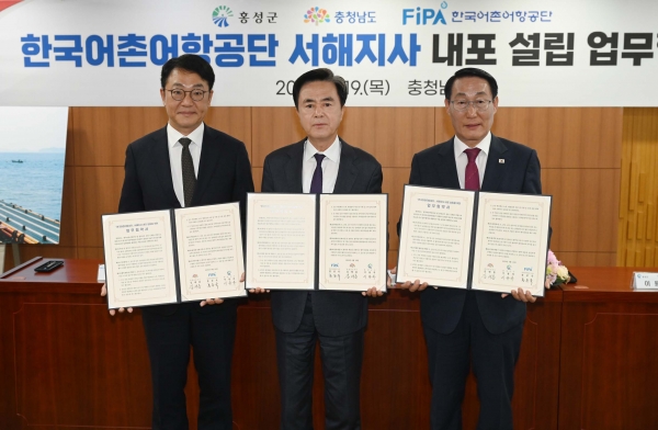 [충청뉴스큐] 충남도-홍성군-한국어촌어항공단이 19일 오전 10시 충남도청에서 한국어촌어항공단 서해지사 설립을 위한 업무협약을 체결했다.