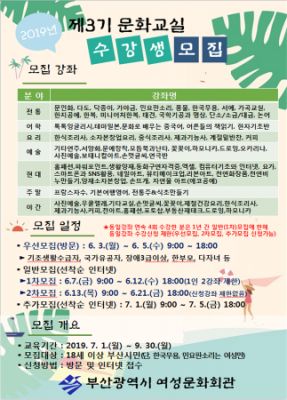 [충청뉴스큐] 부산시 여성문화회관은 시민들의 다양하고 전문적인 능력을 개발하고, 삶의 질 향상을 돕기 위해 2019년 제3기 문화교실 수강생을 모집한다고 밝혔다.