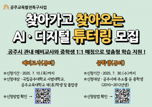[충청뉴스큐] 공주시는 지역 간 교육 격차를 해소하고 개인별 맞춤형 학습 지원을 강화하기 위해 오는 8월 1일부터 관내 예비 교사와 중학생이 함께하는 ‘찾아가고 찾아오는 AI·디지털 튜터링’을 운영한다고 26일 밝혔다.