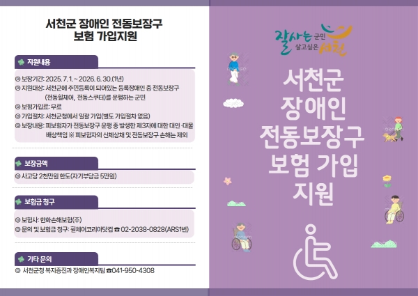 [충청뉴스큐] 서천군은 전동보장구를 이용하는 장애인의 안전과 권익 보호를 위해 ‘장애인 전동보장구 배상책임보험’ 가입을 지원한다.