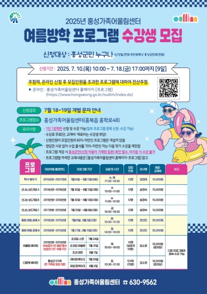 모집 기간은 7월 10일 10:00부터 18일 오후 5시까지로 홍성가족어울림센터 홈페이지에서 온라인 접수로만 가능하다.