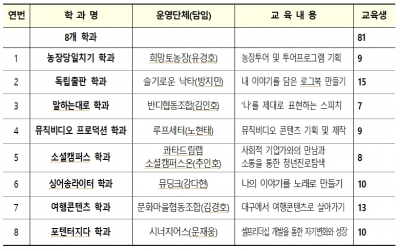 교육대상으로 결정된 청년들은 농장당일치기학과, 독립출판학과, 말하는대로학과 등 8개 학과 중 본인이 흥미와 관심이 있는 1개 학과를선택해 2개월간 참여와 실습위주의 교육을 받게 되며, 총8회중 6회이상 참여하면 수료자격을 얻게 된다.