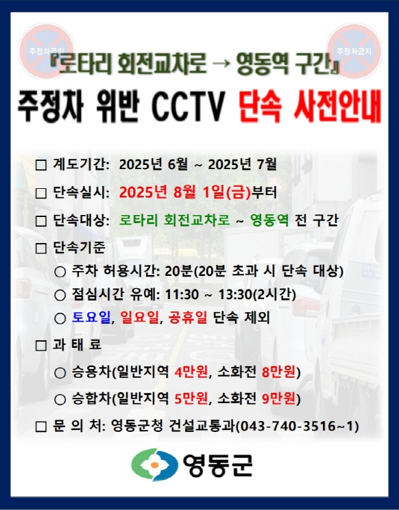 [충청뉴스큐] 충북 영동군이 도심 내 주차난 해소와 교통 질서 확립을 위해 ‘중앙로타리 회전교차로~영동역’ 구간의 노상주차장을 전면 폐지하고 유예 중이던 주정차 위반 단속을 오는 8월 1일부터 본격 실시한다고 밝혔다.
