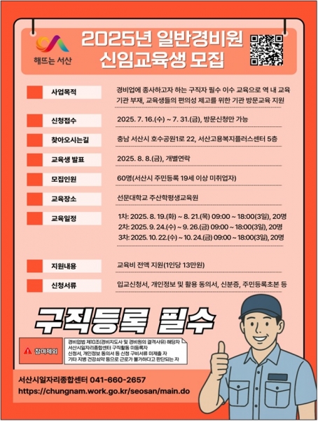 [충청뉴스큐] 충남 서산시는 오는 7월 31일까지 ‘일반경비원 신임 교육 지원사업’의 참가자를 모집한다고 18일 밝혔다.