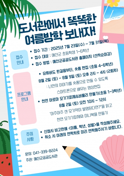 [충청뉴스큐] 예산군립도서관은 여름방학을 맞은 관내 초등학생을 대상으로 오는 8월 2일부터 9일까지 여름방학 프로그램을 운영한다고 밝혔다.