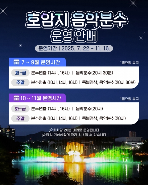 조길형 충주시장은 “호암지 음악분수는 시민들이 도심 속에서도 휴식과 감동을 누릴 수 있는 열린 문화공간이 될 것”이라며 “폭염에 지친 시민들에게 활력을 전하고 충주를 찾는 관광객들에게는 특별한 야경 명소로 자리매김하길 바란다”고 밝혔다.