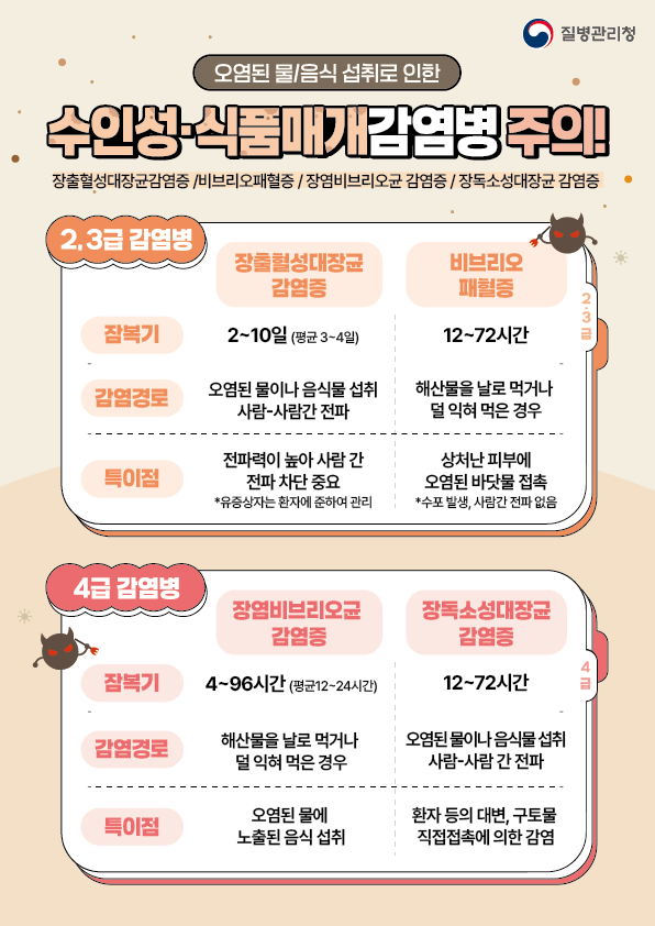 △식수는 반드시 끓여 마시거나 생수 사용 △침수·정전된 냉장고 속 음식은 섭취하지 말고 폐기 △음식은 중심온도 75℃ 이상으로 충분히 익혀 섭취 △조리 전·후, 화장실 이용 후 손 씻기 철저 △설사·구토 등 증상 발생 시 즉시 의료기관 방문 및 보건소 신고특히 어린이집, 학교, 경로당, 복지시설 등 감염에 취약한 계층이 이용하는 집단시설에서는 더욱 철저한 예방 관리가 요구된다.