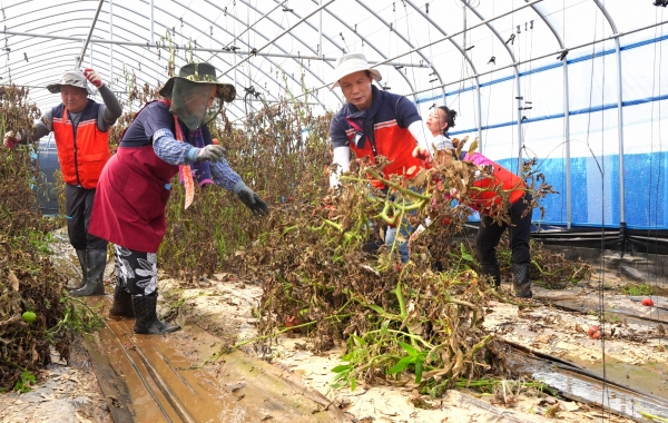 이들은 집중호우로 침수된 원남면 문암리 일원 토마토 재배 피해 농가의 수해 과수를 걷어내며 구슬땀을 흘렸다.
