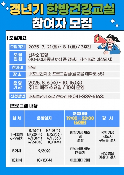 [충청뉴스큐] 예산군 내포보건지소는 2025년 하반기 갱년기 한방건강교실 참여자 12명을 선착순 모집한다고 밝혔다.