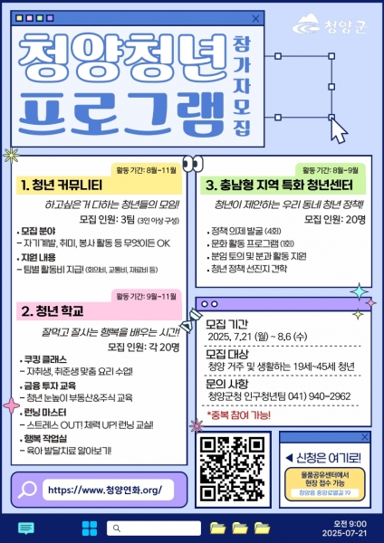 [충청뉴스큐] 청양군은 지역 청년들의 소통과 성장을 지원하고 청년들이 직접 지역문제를 고민하며 정책을 제안할 수 있도록 돕는 다양한 참여 프로그램을 8월부터 본격 추진한다고 밝혔다.